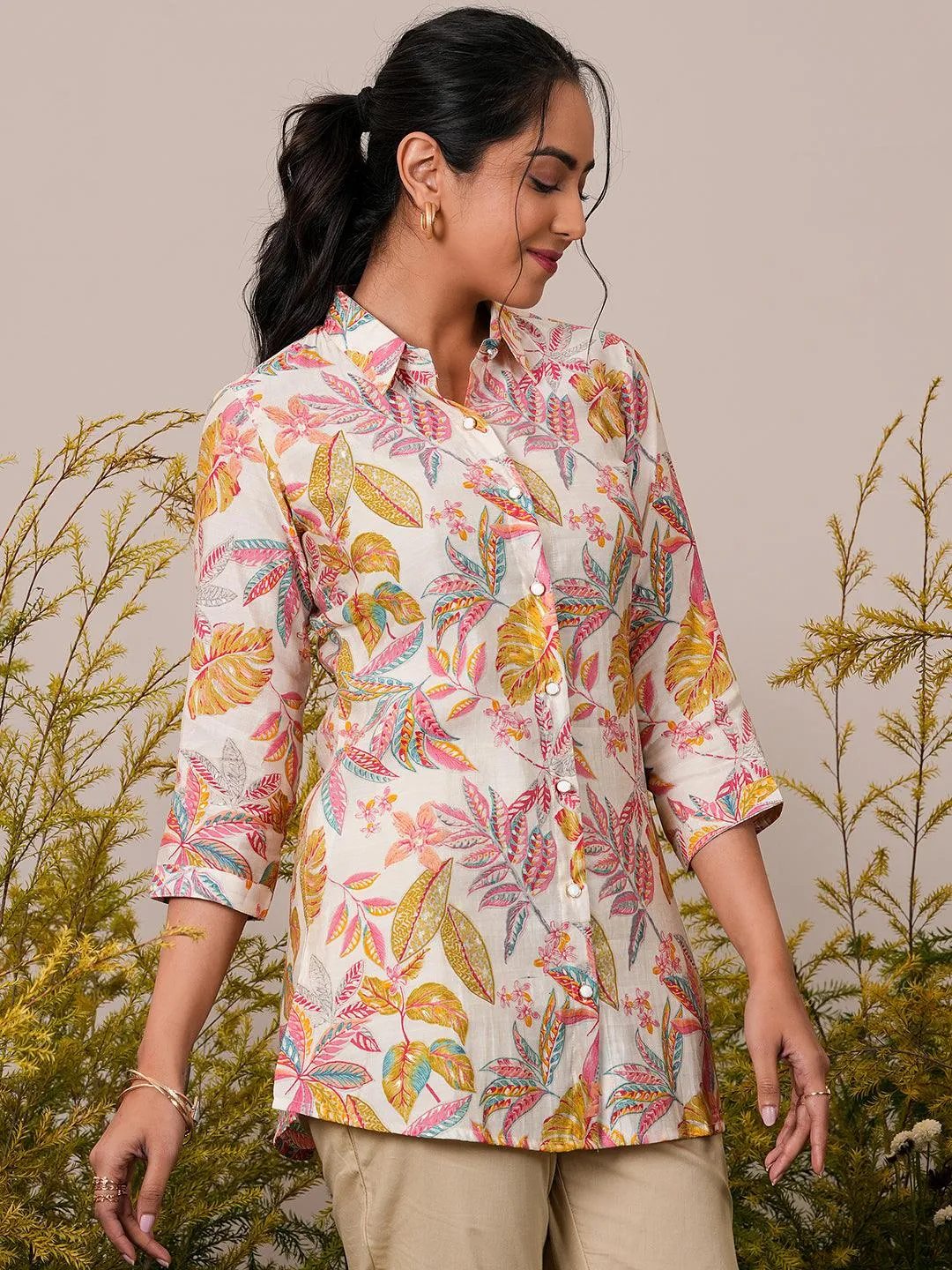Cream Printed Silk Blend A-Line Kurti