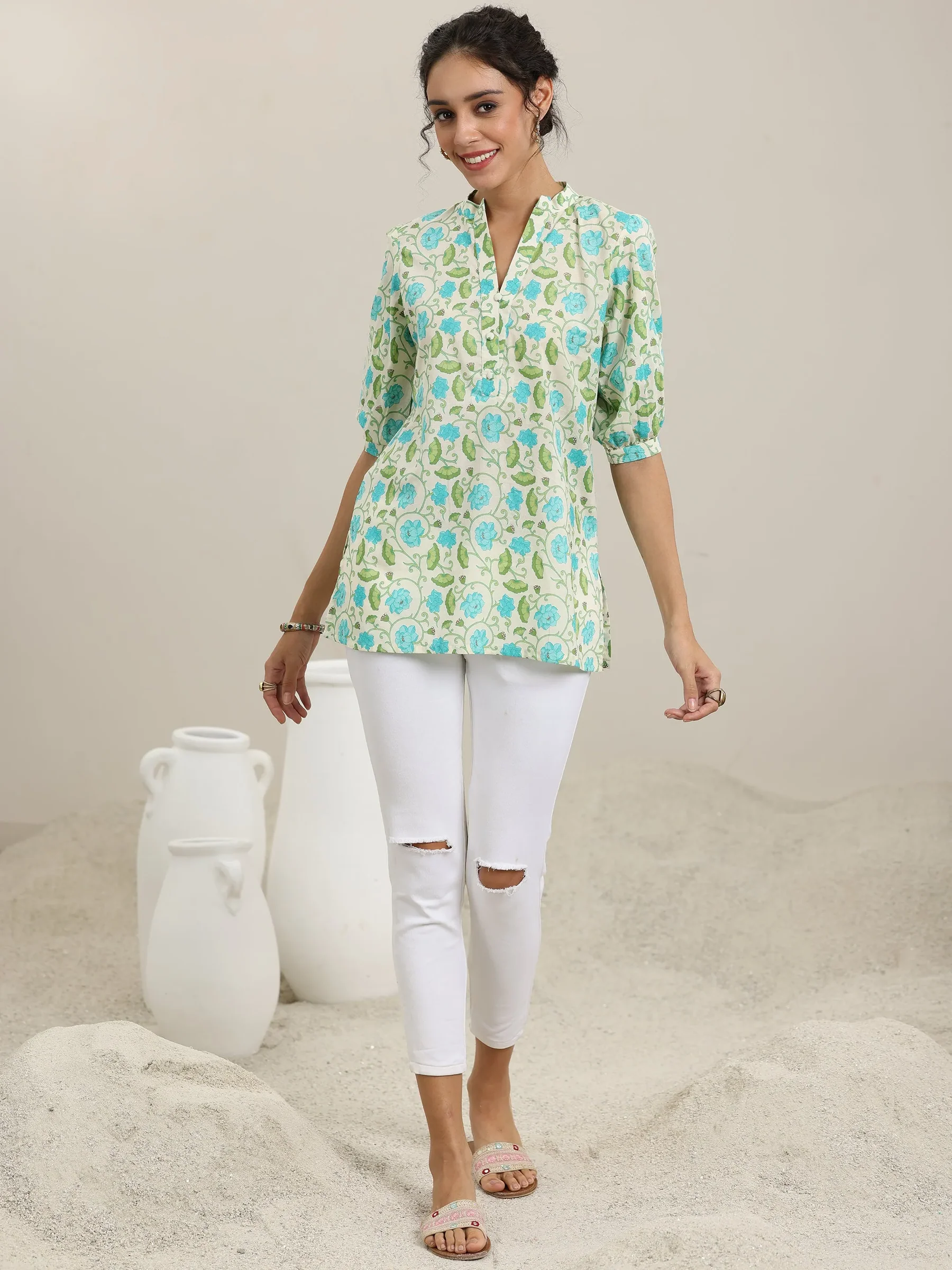 Off White Printed Cotton Straight Kurti
